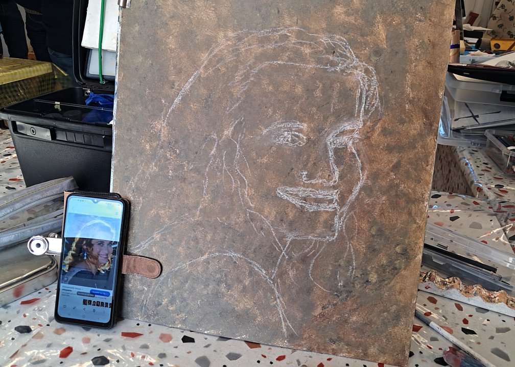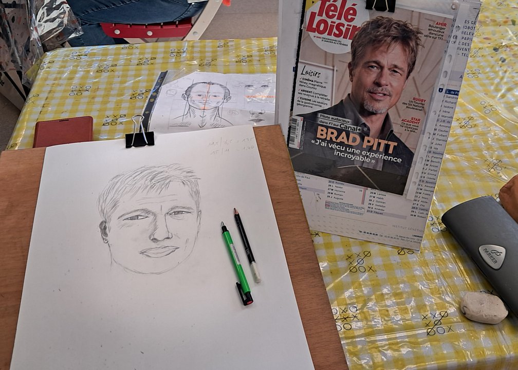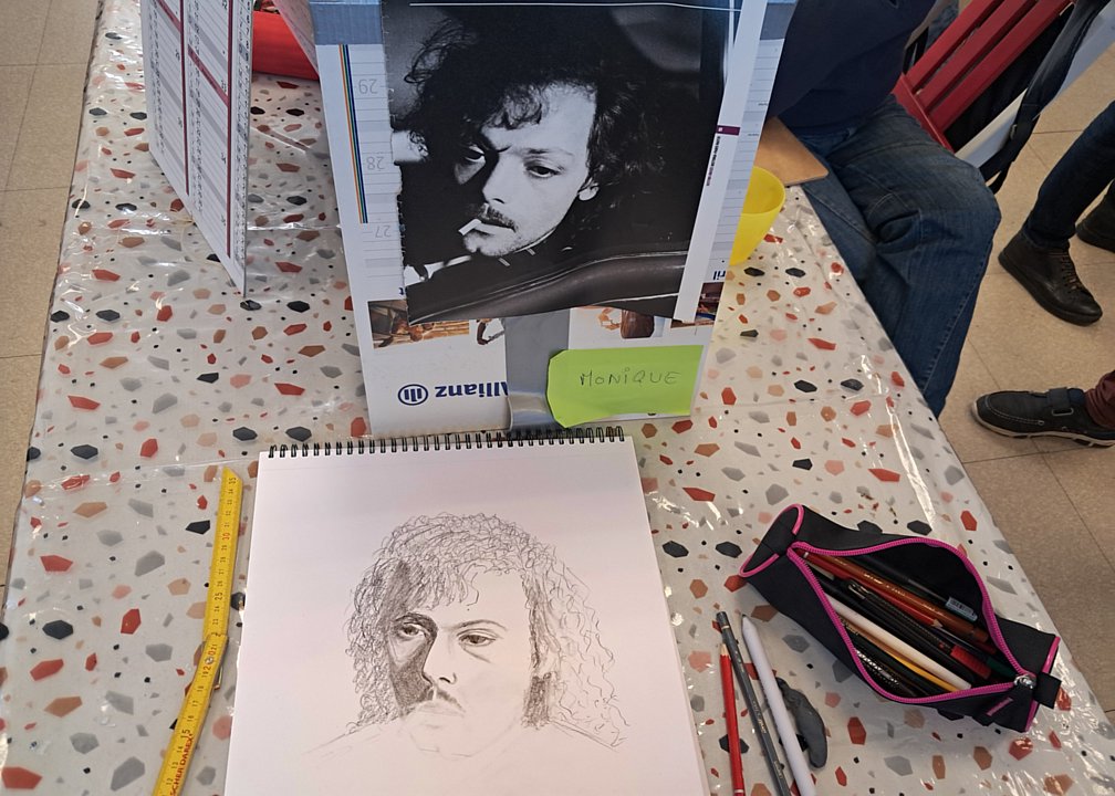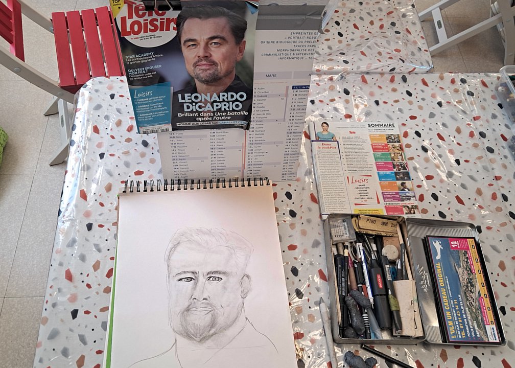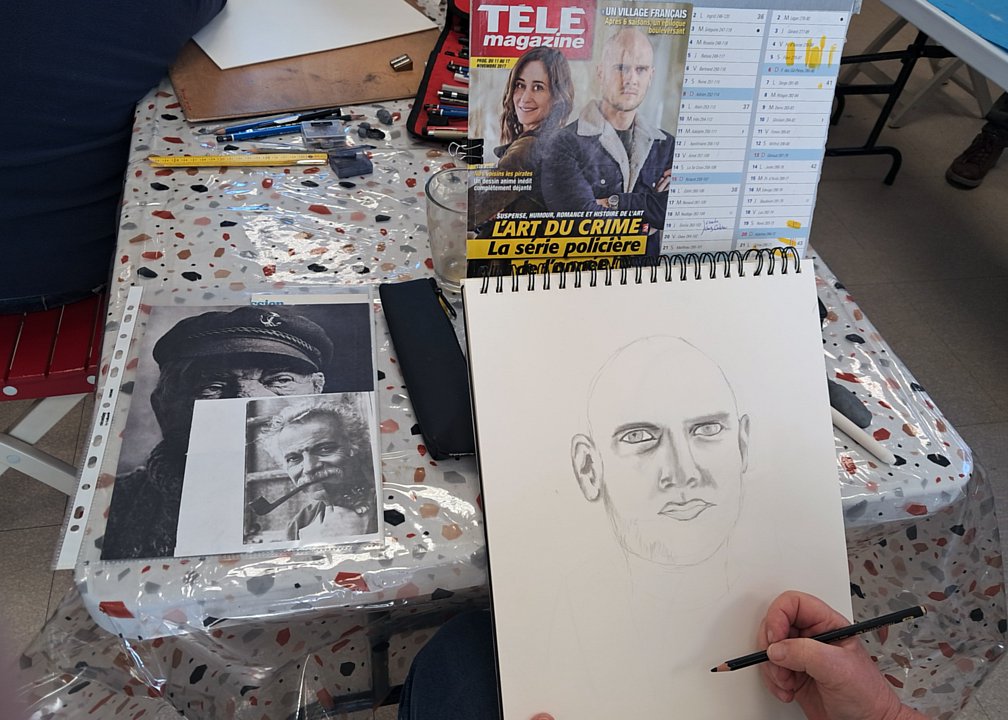 Toujours les même diversités, de sujet avec bien sûr des têtes connues, mais aussi des thèmes plus personnels, et de techniques (dont une esquisse à la craie blanche ; l’heure de la visite fait que les œuvres du jour sont entamées, mais non finies)