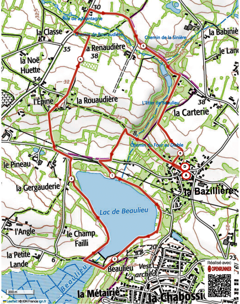 A partir de la Bazillière, nous empruntons le chemin du Four au Diable puis longeons le lac de Beaulieu et cheminons dans les bois environnants vers la Rouaudière dont la Croix, à l’origine incertaine 1602 ou 1682 ?, est l’une des plus anciennes de la commune. Puis le chemin de la Sinière nous amène vers l’étier de Beaulieu que nous longeons pour regagner le car.