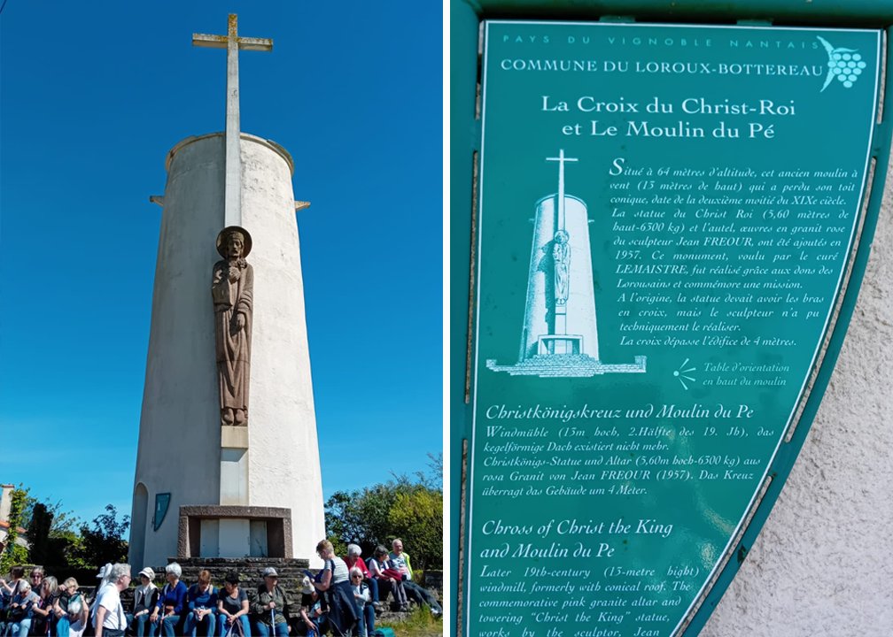 Ce moulin, édifié à 64m d’altitude, fait environ 13 m de haut. Il date de la seconde moitié du XIXe siècle et a perdu son toit conique. Il a été transformé en calvaire en 1957. Adossée au moulin, une statue du Christ Roi de 5,60 m a été ajoutée vers 1957-1960. Cette œuvre du sculpteur Jean Fréour commémore une mission religieuse locale. Le moulin offre un superbe panorama sur le vignoble, du Pont de Cheviré au Marais de Goulaine en passant par le Sillon de Bretagne et la Tour de Bretagne, sans oublier les clochers des communes de l’agglomération. Depuis 2024, l’accès intérieur et donc à la table d’orientation du sommet est interdit pour des raisons de sécurité.